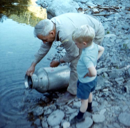Jack Brooks with his grandson releasing salmon fry