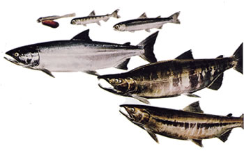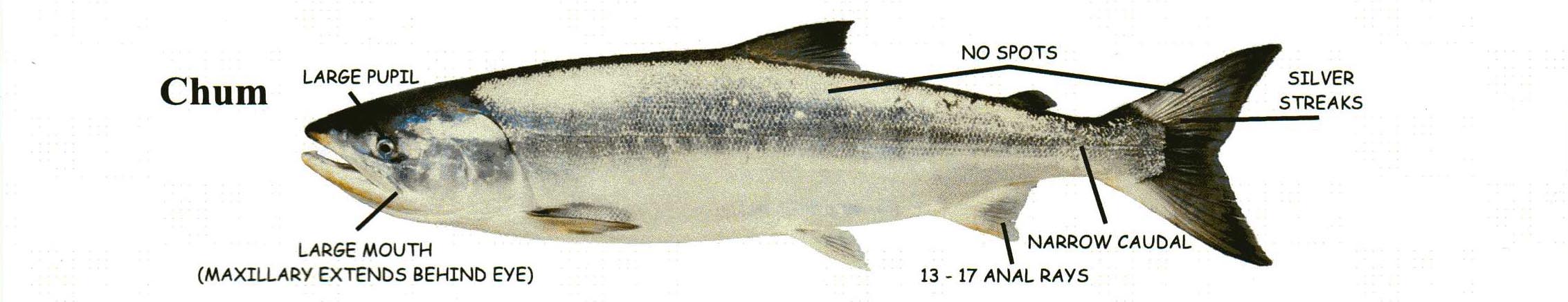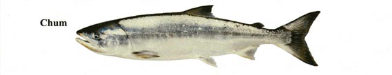 Chum Salmon reproduce along the North American coast from Oregon to the Mackenzie river. Chum spawn in over 880 moderate sized coastal streams in British Columbia. Most Chum spend two to four summers at sea before returning to their streams of origin to spawn. Chum, also known as "dog" salmon from the large canine teeth of spawning males, are the second largest Pacific salmon, weighing up to 40 pounds. Spawning males develop reddish vertical bars on their flanks; females have a reddish lateral band. Although Chum are fast swimmers, they are not good jumpers, and they do not migrate far inland to spawn.